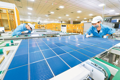 圖為安徽華晟新能源科技股份有限公司的異質(zhì)結(jié)光伏電池及組件工廠內(nèi),技術(shù)人員在對產(chǎn)品進行檢測。 徐 勇攝(新華社發(fā))