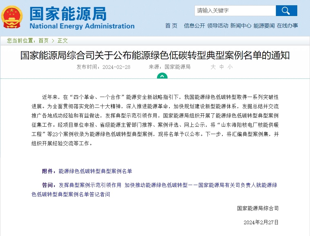 2月28日,國家能源局公布能源綠色低碳轉(zhuǎn)型典型案例名單,23個(gè)典型案例涵蓋能源生產(chǎn)供應(yīng)、加工轉(zhuǎn)化、終端消費(fèi)等各個(gè)環(huán)節(jié),主要包括綠色能源供給新模式類、城市(鄉(xiāng)鎮(zhèn))能源增綠減碳類、能源產(chǎn)業(yè)鏈碳減排類、用能企業(yè)(園區(qū))低碳轉(zhuǎn)型類等四個(gè)類別,在各領(lǐng)域具有較強(qiáng)的代表性。